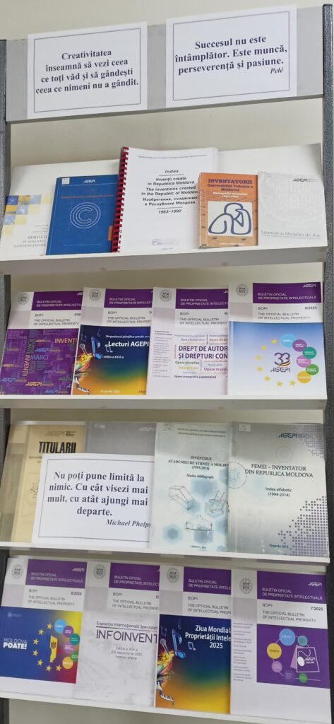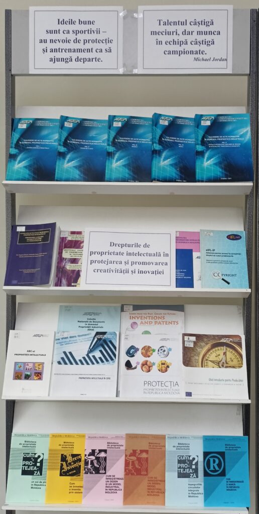 - – expoziție documentară ,,Drepturile de proprietate intelectuală în protejarea și promovarea creativității și inovației” dedicată proprietății intelectuale, cu resurse relevante din colecțiile bibliotecii;